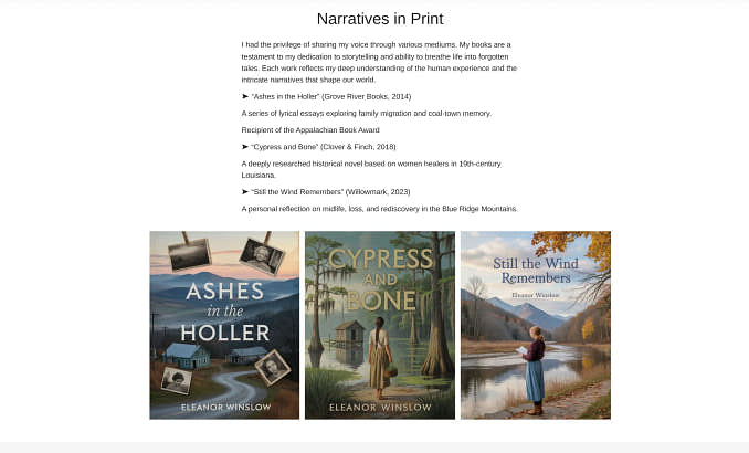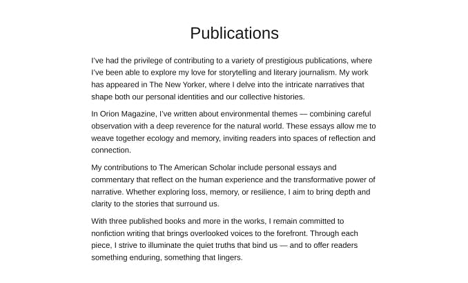 It’s easy to rearrange sections or add new writing samples as you go. The text remains readable on any screen, and the contact form doesn’t interrupt the flow—just quietly offers a way to follow up when they’re ready.
