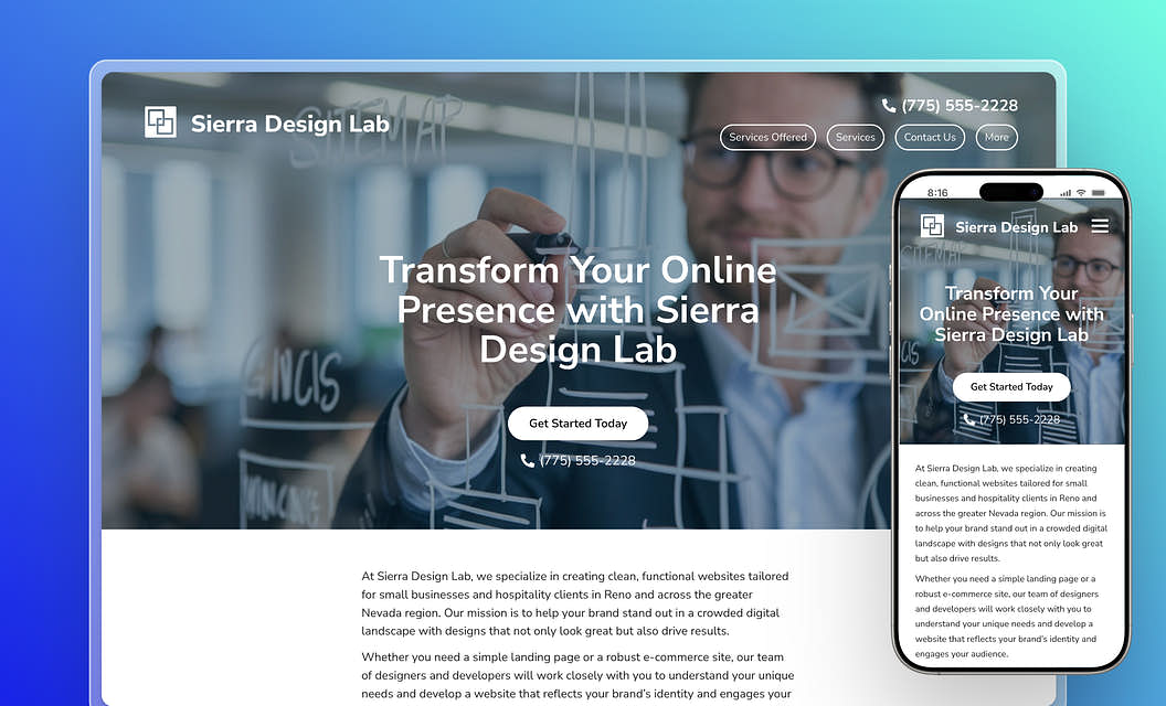 Sierra Design Lab: Need more local bookings? This clean layout makes sure your web design services shine and your contact form is easy to find, so people in your area can reach out fast — whether they’re on mobile or desktop.