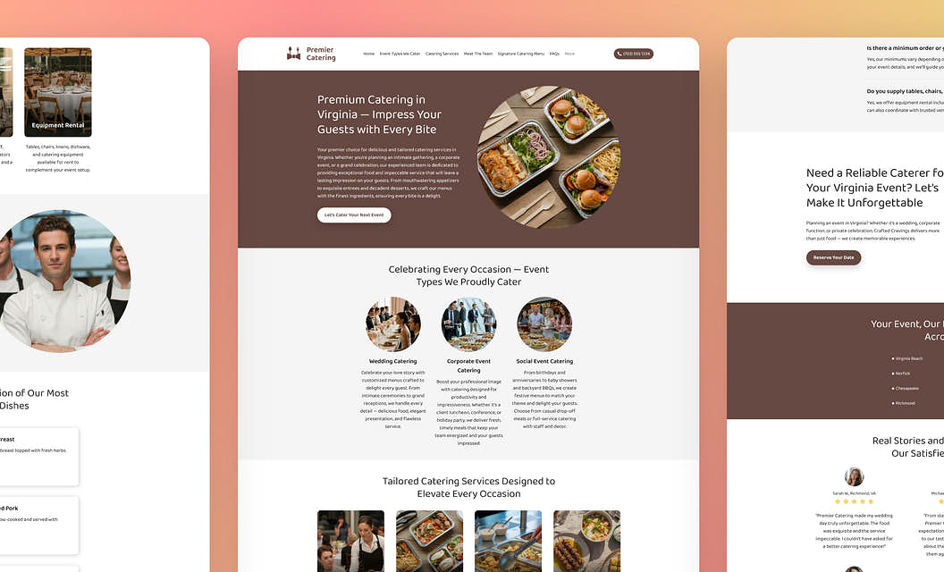 Premier Catering: You don’t need to say “professional” when your catering site shows it. With clean photos, smooth mobile code, and space for tailored menus, this one’s made to earn trust and turn interest into action.