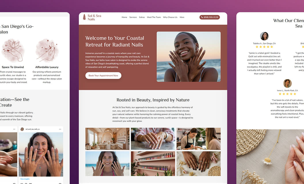 Sol & Sea Nails: Let customers feel the calm before they even step inside your nail studio. This clean, full-width layout gives your salon a spa-like presence online, making it easy to book appointments and trust in your care.