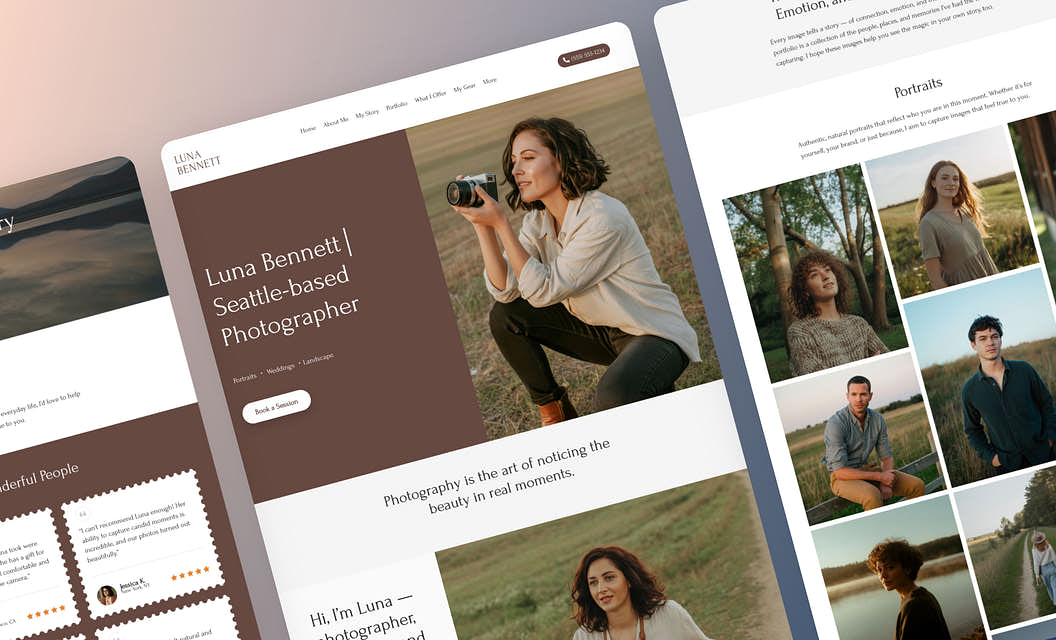 Luna Bennett: Stay connected with potential clients even when you're on location. This clean, image-led layout makes it easy for people to imagine their next shoot with you. Whether they’re booking portraits or browsing wedding galleries, the experience feels thoughtful and personal.