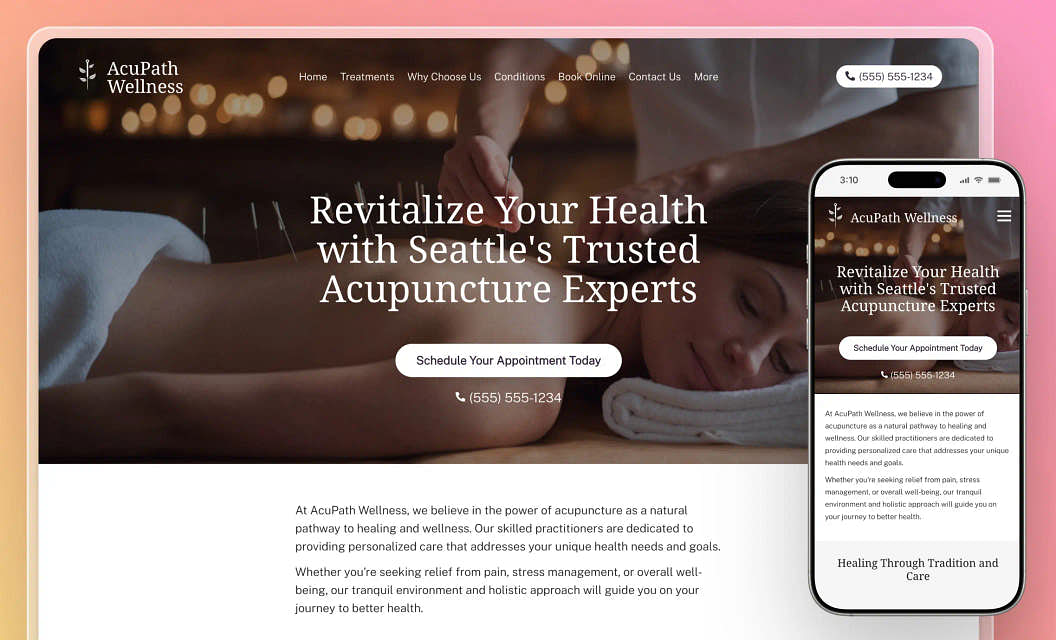 AcuPath Wellness: Show clients your expertise with a template that feels warm and inviting. They can reach out instantly, explore your treatments, and get to know your services at first glance.
