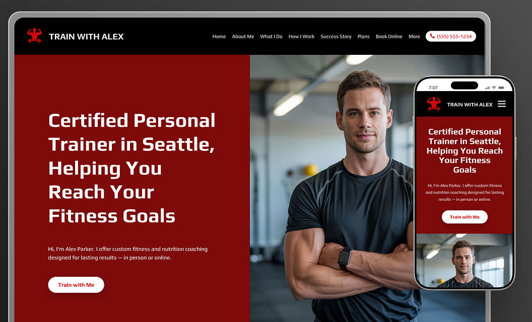 Train with Alex: Turn gym-goers into clients before they ever set foot in your studio. With bold colors, a powerful headline, and a confident hero image, this template is built to motivate. It puts your contact info and services front and center, making it easy for clients to book training sessions fast.