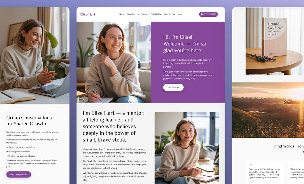 Elise Hart: Create a calming digital space that invites trust and introspection. Ideal for coaches, counselors, and mentors, this layout pairs warmth with purpose. Friendly photos, gentle colors, and easy contact options make it feel like the first step in a supportive journey.