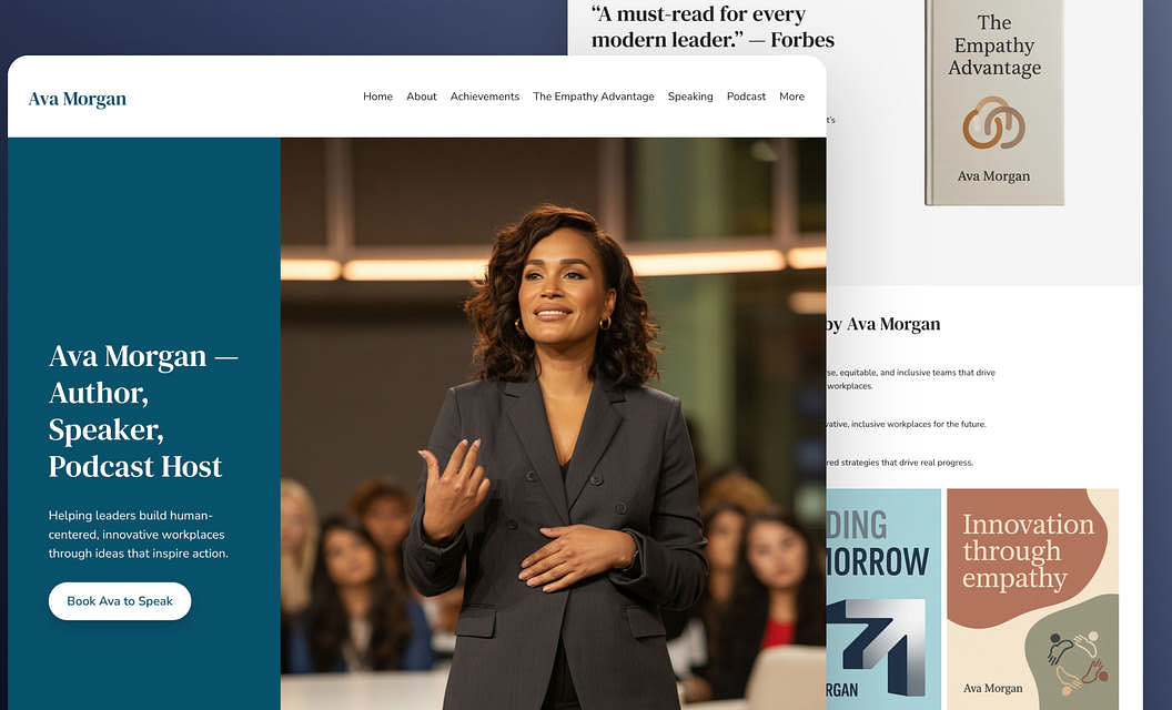 Ava Morgan: Position yourself as a thought leader the moment the page loads. This polished template is perfect for speakers, authors, and consultants. Bold fonts, book highlights, and speaking CTAs make it easy to land gigs, and grow your following.