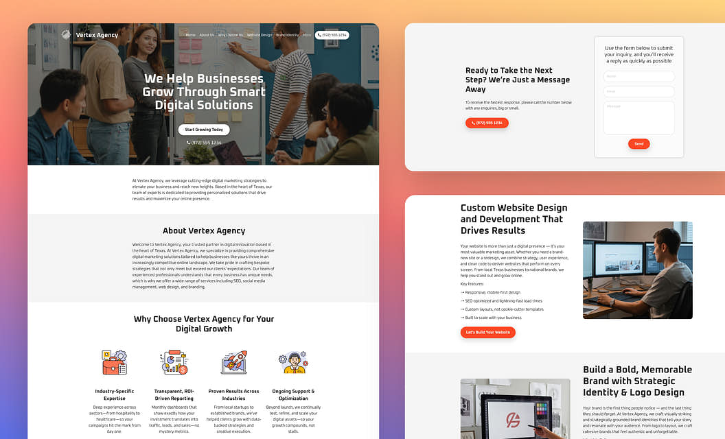 Vertex Agency: Perfect for fast-moving agencies, this design leads with momentum. A dynamic hero section grabs attention, while trust icons, feature lists, and bold CTA buttons keep the focus on results. It’s mobile-optimized, startup-friendly, and conversion-conscious.