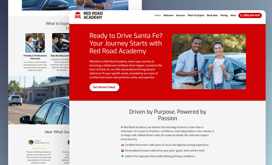 Red Road Academy: Let your driving services speak for itself with a bold, professional website that builds trust from the first click. This layout puts your instructors front and center, uses clear calls to action, and keeps the contact process simple — whether visitors are on their phones or at home.