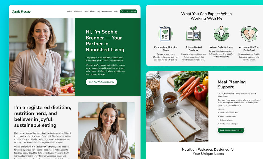 Health With Stella: Warm, inviting, and personal, this design showcases the coach as a trusted partner in health, supported by approachable imagery and easy-to-read sections. The site balances professionalism with personality, helping potential clients feel confident about booking.