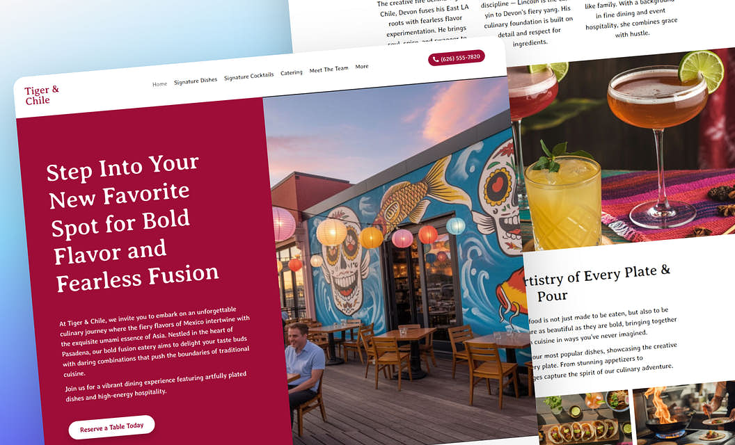 Tiger & Chile: Turn heads with a vibrant, fearless look that mirrors your culinary edge. With bold color blocking, punchy headlines, and eye-catching murals, this website design makes a statement—just like your food.