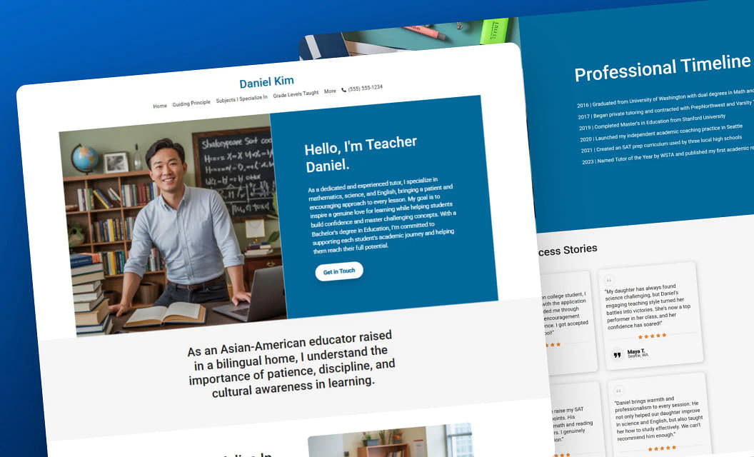 Summit Scholars: This sleek, blue-accented template conveys trust, professionalism, and proven results. Its layout emphasizes clarity and modern appeal, perfect for building authority in competitive tutoring markets.