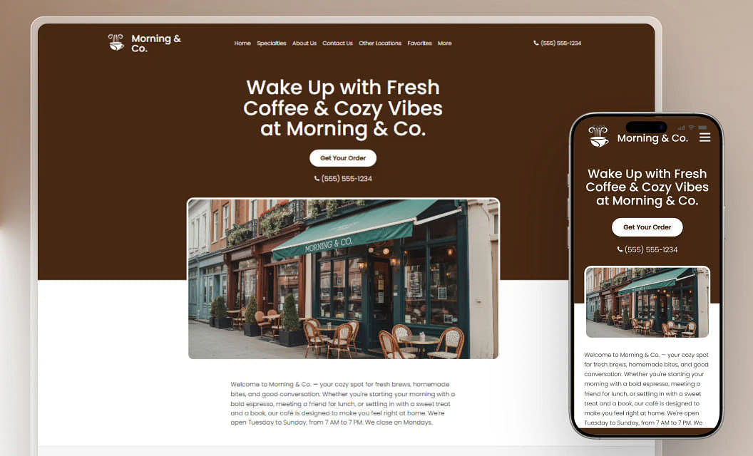 Morning & Co.: Everything about this brown layout says easy — easy to browse, easy to contact, easy to spot key details. Morning guests will feel cared for right away.