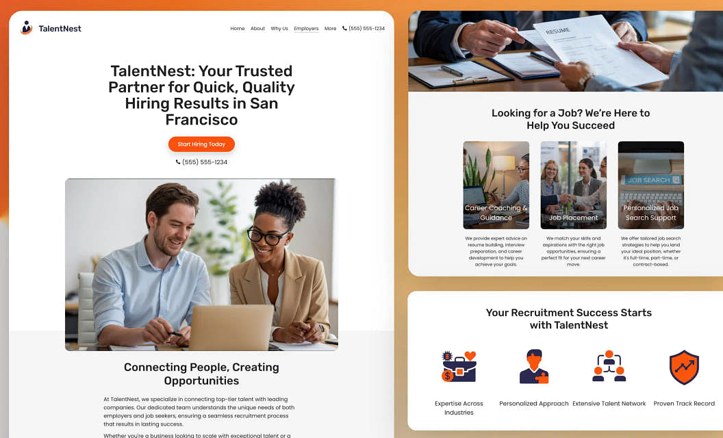 TalentNest: Connect candidates with opportunities through this flexible, customizable template design. Showcase client success stories and build trust with a compelling testimonial section.