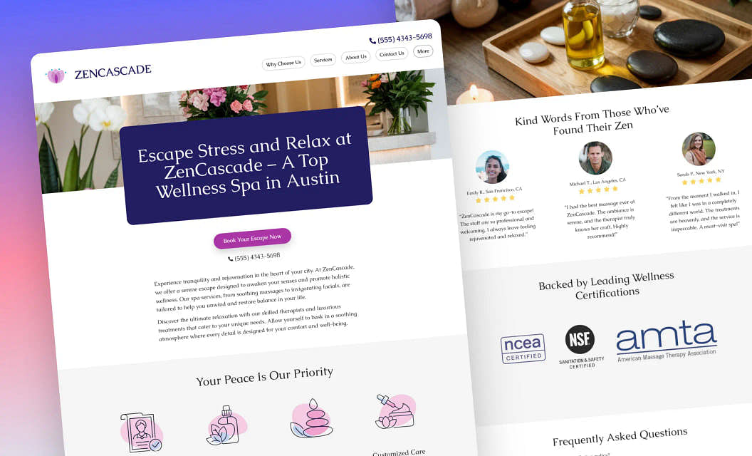 ZenCascade: New clients trust spas that feel soothing from the start. The calm design, big call-to-action buttons, and a user-friendly experience help you turn browsers into regulars.
