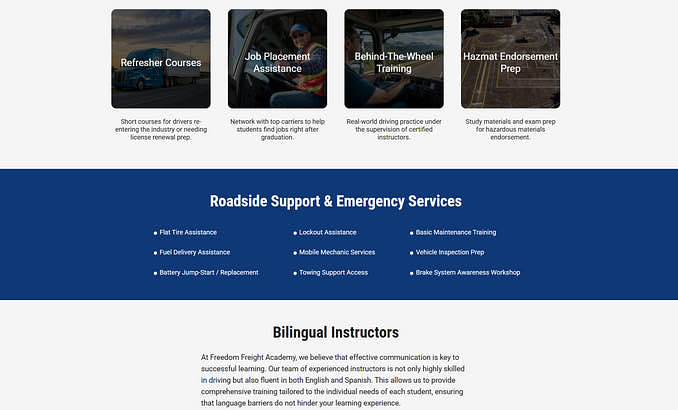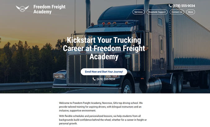Want more bookings without chasing leads? This high-contrast template puts your contact info front and center, helping customers take action fast. The strong typography and dark overlay on the full-width banner build trust instantly — perfect for CDL schools focused on professionalism. With Zarla’s AI-powered editing tools, you can update course info, add bilingual options, and personalize your site in minutes.