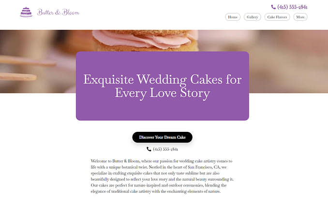 This nature-inspired template blends floral visuals with soft purples and clean white space to create a calm, inviting experience. The layout draws attention to your most eye-catching cakes with high-res photos and subtle section breaks, making it easy for customers to browse and book. Light typography keeps things approachable, while the contact form and gallery feel effortless to navigate on any device.