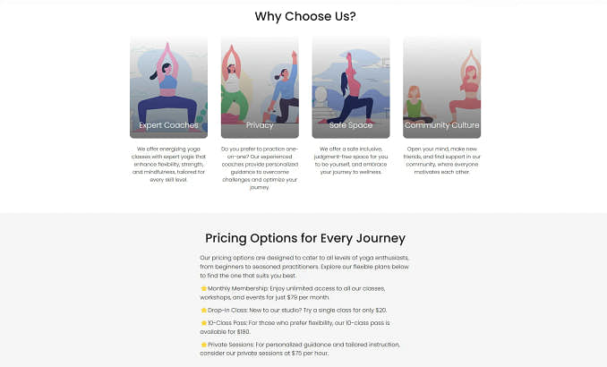 Running a studio with lots going on? This layout keeps things tidy. You can feature your classes, private coaching, workshops, or events without it ever feeling crowded. The sticky menu helps visitors stay oriented, especially on longer pages.