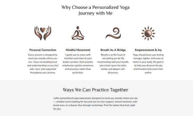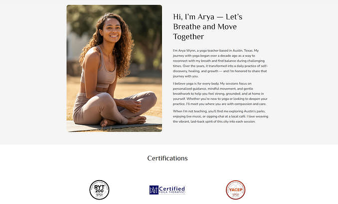 Designed to feel like an invitation, this layout keeps your story at the center—while also driving action with clear calls-to-book and mobile-ready design. You can update content with easy-to-use editing tools, showcase upcoming workshops, and link to your favorite scheduling app in seconds. With built-in SEO, your site stays visible to local students searching for personalized, grounded yoga—and helps them book with confidence and ease.