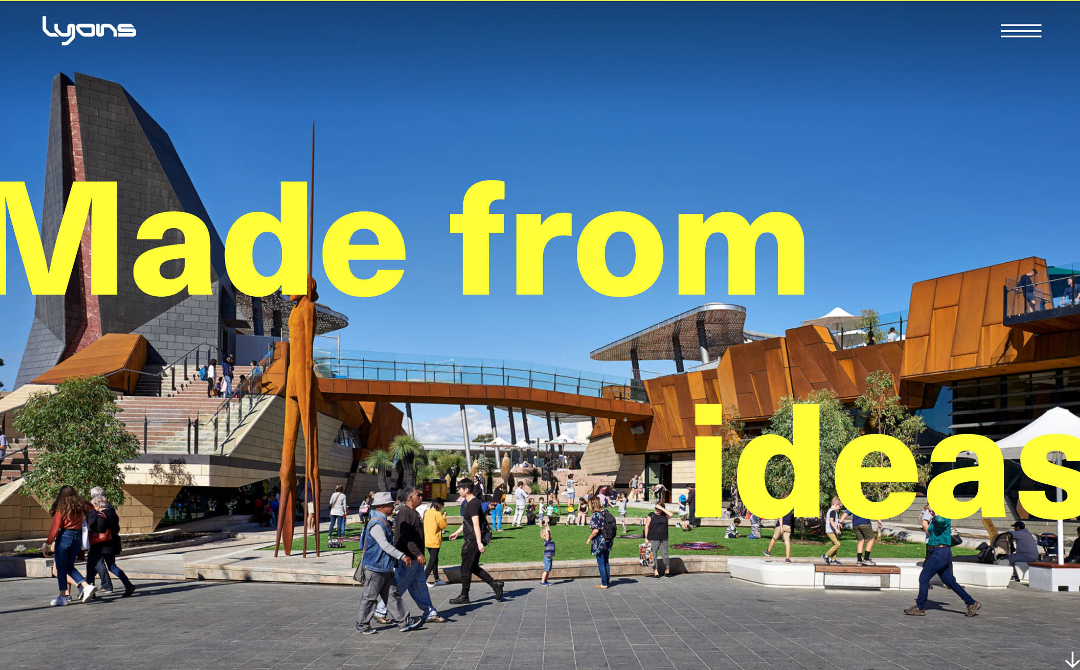 Lyons Studio is a public architectural and urban design practice that caters to clients throughout Australia. The website's bright color palette caught my attention and I liked the visual appeal of an impactful tagline overlaying the hero image depicting one of the firm's previous projects.