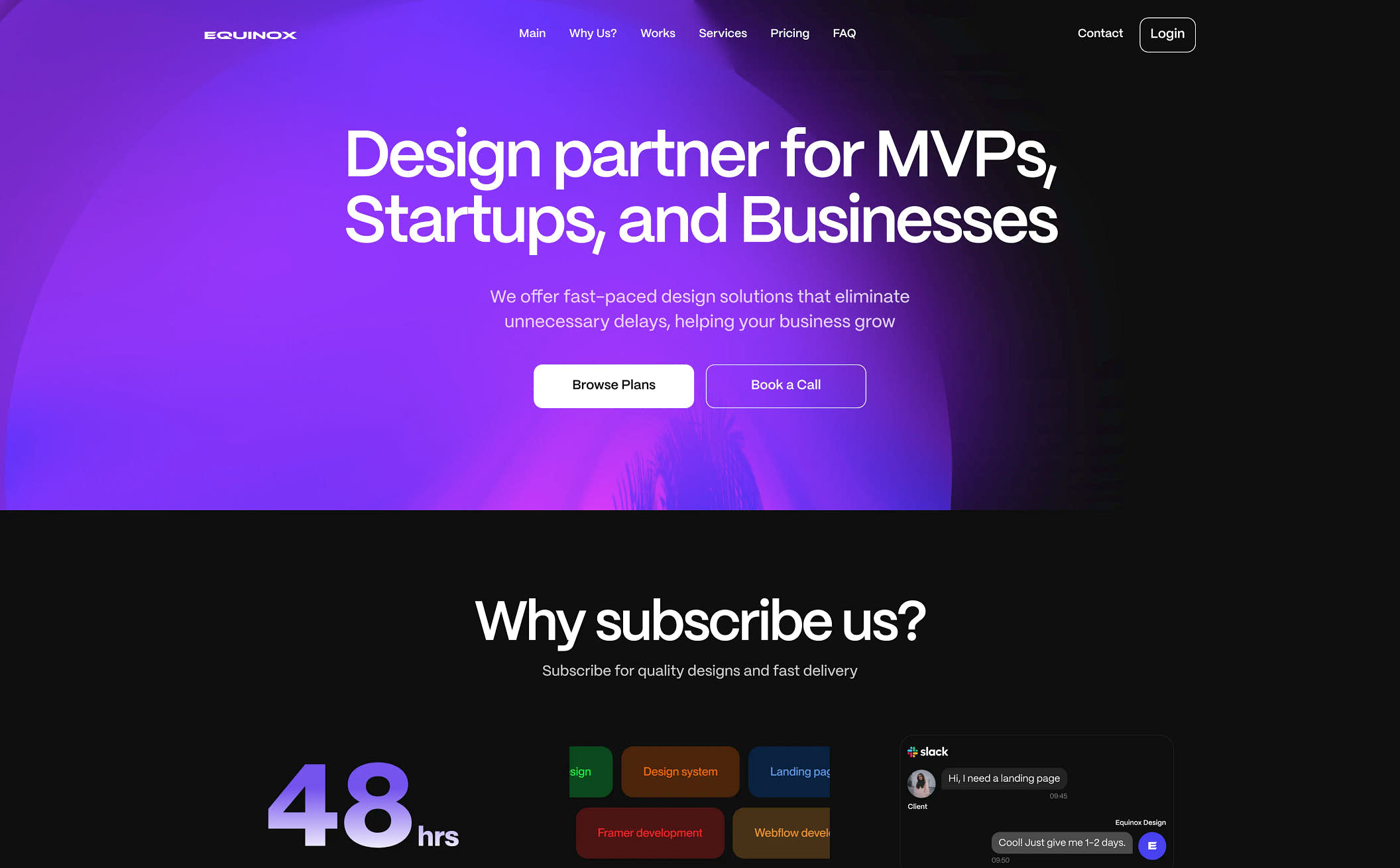 Equinox Design’s website feels like stepping into a high-tech art gallery. With a sleek black background and glowing purple highlights, it looks super modern and cool. The animations are smooth, and everything loads quickly, showing how to keep visitors interested.