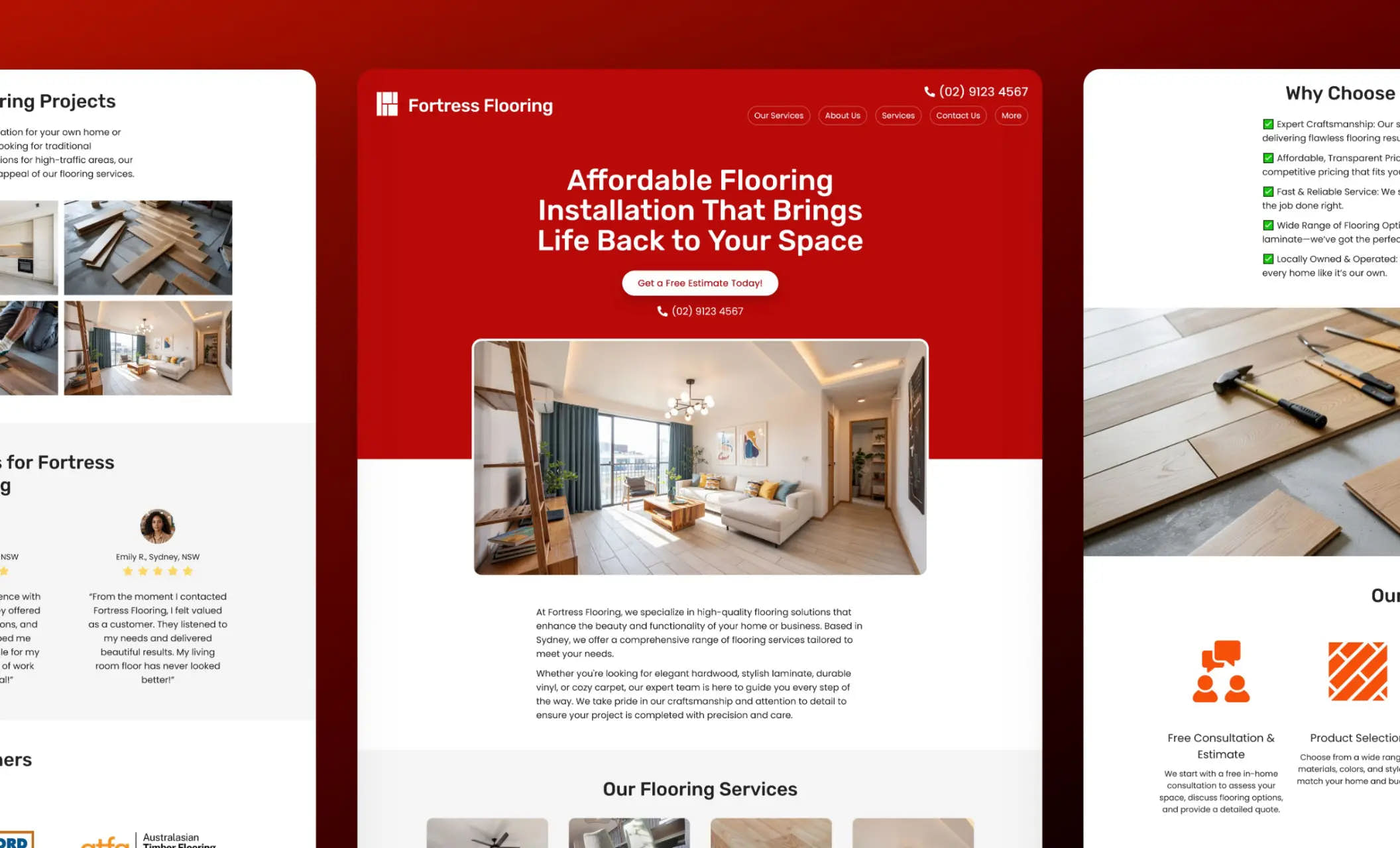 Want people to feel confident hiring you? This bold red design makes a strong first impression, then backs it up with striking photos, simple navigation, and a clear lead form.