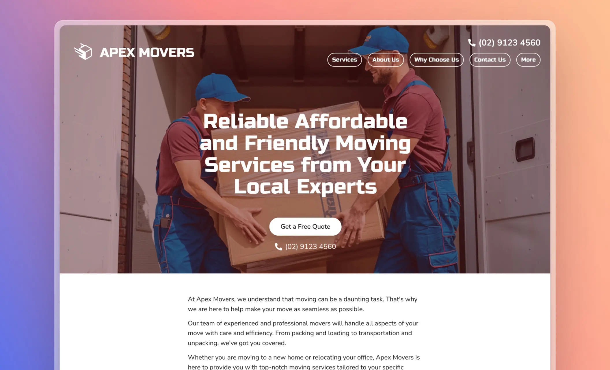 This modern, full-screen design keeps the focus on your team’s professionalism and reliability. The streamlined contact button and mobile-friendly setup mean clients can reserve their movers in just seconds.