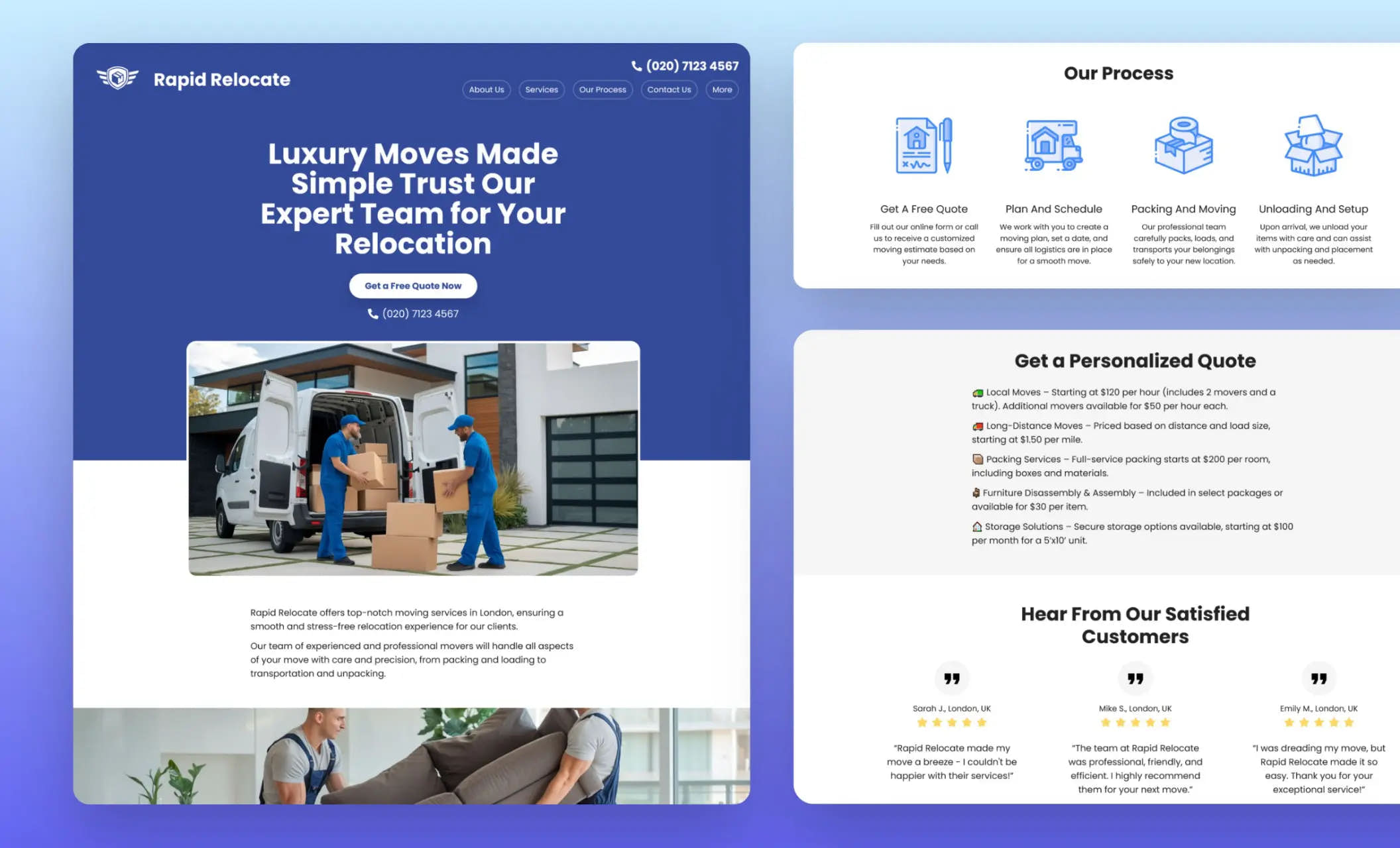 Designed for speed and efficiency, this site mirrors the brand’s promise of stress-free moving. Service breakdowns, transparent pricing, and a strong central call-to-action keep visitors focused on booking right away.